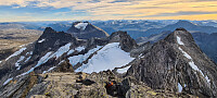 Etter en oppvarmingstur til Østkammen på Kuglhornet og Engelskdiedret på Eidetinden, og en hviledag på varme svaberg, var vi klare for den beryktede Stetinden. Hetebølgen i juli var på topp, med opp til 28 varmegrader på dagen. Vår strategi var å starte i bedaglig tempo i ettermiddagen, og klatre gjennom natten. Vi startet 12.30 fra parkeringen, gjekk i rolig tempo til Svartvannet, og tok et forfriskende (iskaldt!) bad og matpause der. Fortsatte deretter mot innsteget på Kongelosjen, over noen småskumle svapartier, og begynte å klatre kl 16. Solkrem og en lett bris tok unna den værste varmen. Varmen ville også avta utover kvelden og jo høyere vi kom. De første 5 taulengdene opp til første amfi gjekk radig og uten større problem, og vi brukte ca. 3 timer på disse. Ruta fant >>>