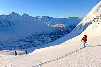 Morgentur med Renate i finværet. Vi hadde hørt noen rykter om pudder fra topp til bunn, så forventningene var høye da vi kom frem til Andersdalen. Det viste seg at det var faktisk puddersnø, men ikke over hele fjellet. Skarejernføre på halvparten av turen opp ryggen! Heldigvis litt mykere og finere på slutten. Det var ordentlig påskestemning da vi nærmet oss toppen og deilig å gå i sola. Da vi var klare for å kjøre ned fikk vi fantastisk silkeføre og fant ut at det var et fornuftig valg å kjøre ned på andre siden av bekkedalen istedenfor å kjøre ned på ryggen. Litt mer snø av den løsere typen her :)