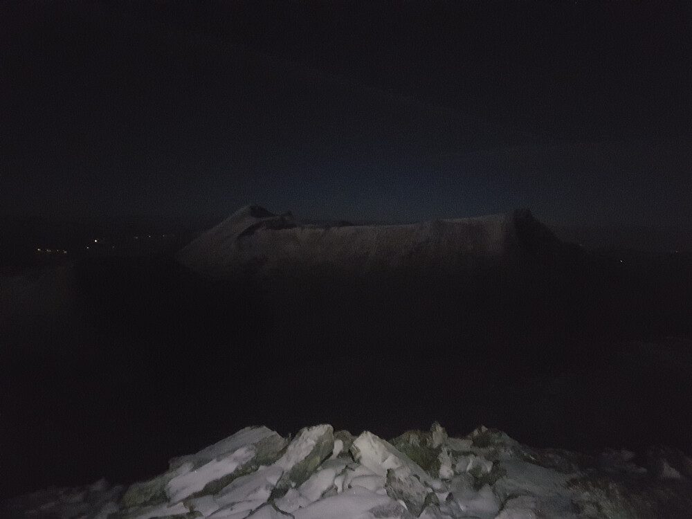 Fullmåne og klarvær ga noe så sjeldent som en knallfin kveldstur i november. Vi gikk egentlig feil i starten og fulgte stien mot Litledalsvatnet i stedet for direktevarianten rett opp fra parkering (noe som var flaks ettersom det på tur ned viste seg at den stien var mye tørrere enn direktevarianten). Tynt snølag de siste par hundre høydemtrene. Med på tur Oda og Ylva.