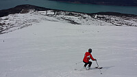 Hard skare ned bratthenget fra nordtoppen (ny erfaring for Synnøve, som hun mestret utmerket). Etter hvert nydelig lettkjørt snø ned mot Nysetra. Flott fjell som jeg ser fra kjøkkenbordet hver dag..