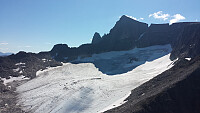 Fint å gå over Adelsbreen med fint firnlag på blåisen. Den flotte ruten/ryggen fra Adelsfjellet til Nordre Trolltinden er bare en nytelse, med storslagen natur på alle kanter. Nordre Trolltind - her var det bare å nyte den spektakulære utsikten lenge, i helt vindstille vær og sol!