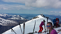 Fantastiske utsiktstopper, med nærkontakt til den berømmelige R2-linjen (nedturen mellom nabotoppene Månvasstinden og Storbua). Tok også turen bort til nordvest-toppen på Kjøsen, og har registrert den :-). Nedturen (mot nordøst) bar preg av den plutselige varmen som kom denne lørdagen. Utløste sørperas i hver sving i de bratteste hengene, men greit å svinge unna (ufarlige ras). Nedfarten er forøvrig fantastisk, og frister til gjentagelse (da >>>