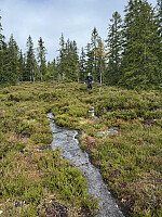 Turen gikk videre oppover bekkedalen mot Storetjødn. Det var et ganske myrete og vått terreng. Men det har vært noen dager >>>