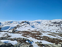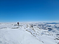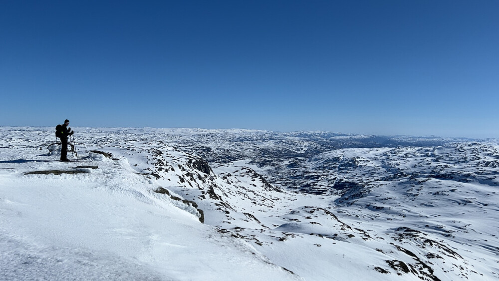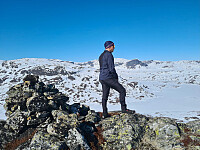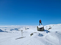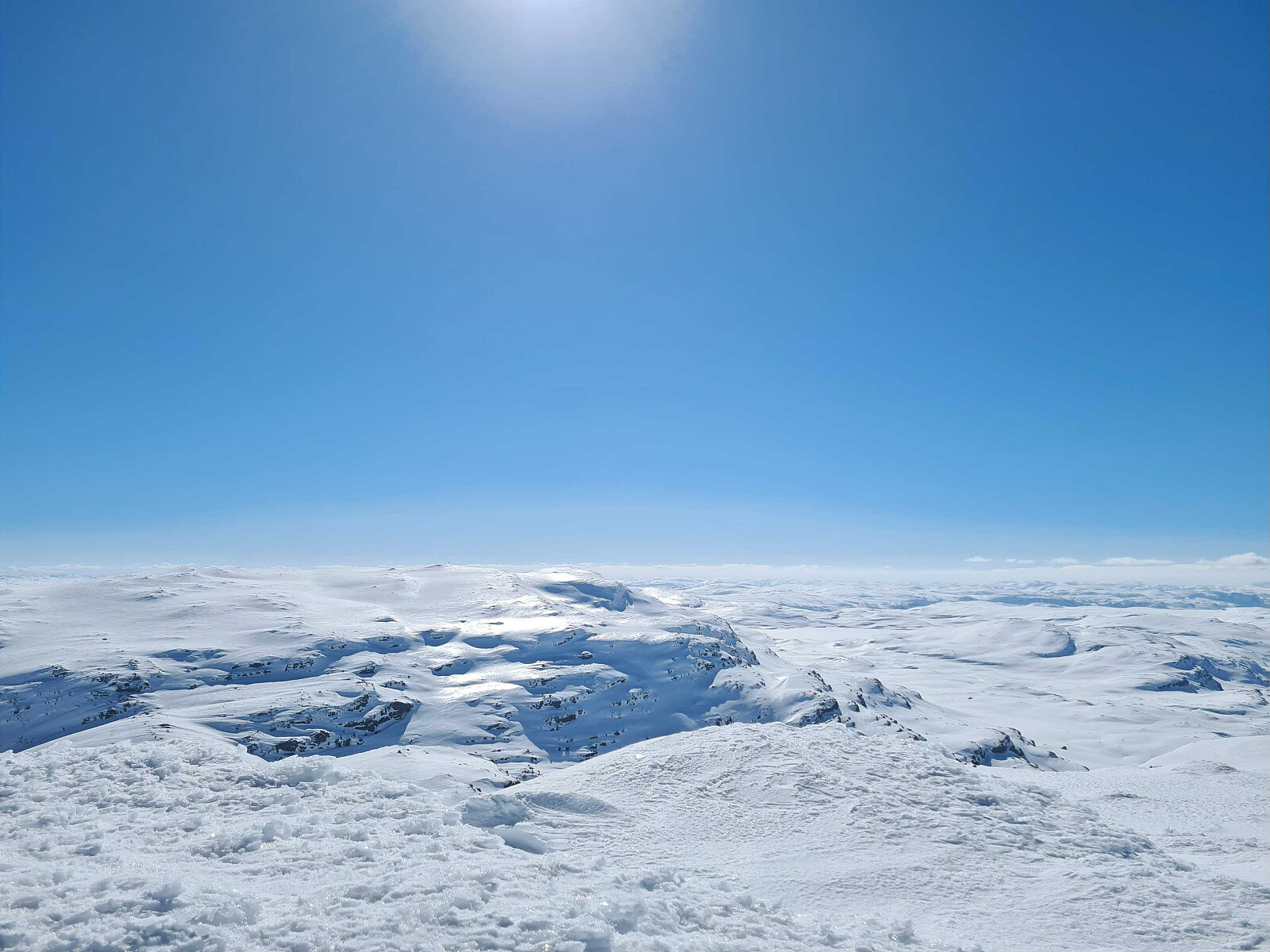 På toppen var det en strålende utsikt til alle kanter; snø, fjell og vidder på alle kanter. Et fantastisk skue som er nesten umulig å fange på er bilde. Her oppe i høyden kom det en kald trekk fra nord, så vi fant le på solsiden og spiste nisten og slappet av og bare nøt omgivelsene.