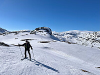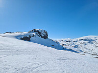 Kista ligger som en kjøttkake på toppen av en rygg. Den er bratt på alle kanter med mørke fjellsider der det ikke er snø, så vi måtte finne en vei opp med minst mulig klyving og klatring. På sørsiden satte vi fra oss skiene og fulgte en tunge av snø oppover til et lite skard, eller mer en sprekk i fjellet. Her måtte vi forsere et par enkle klatreopptak (klyving) for å komme oss opp. Artig liten topp med god utsikt mot Haukeliseter fjellstue og spesielt den bratte sørsiden av Store Nup.