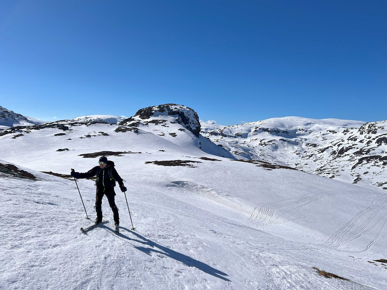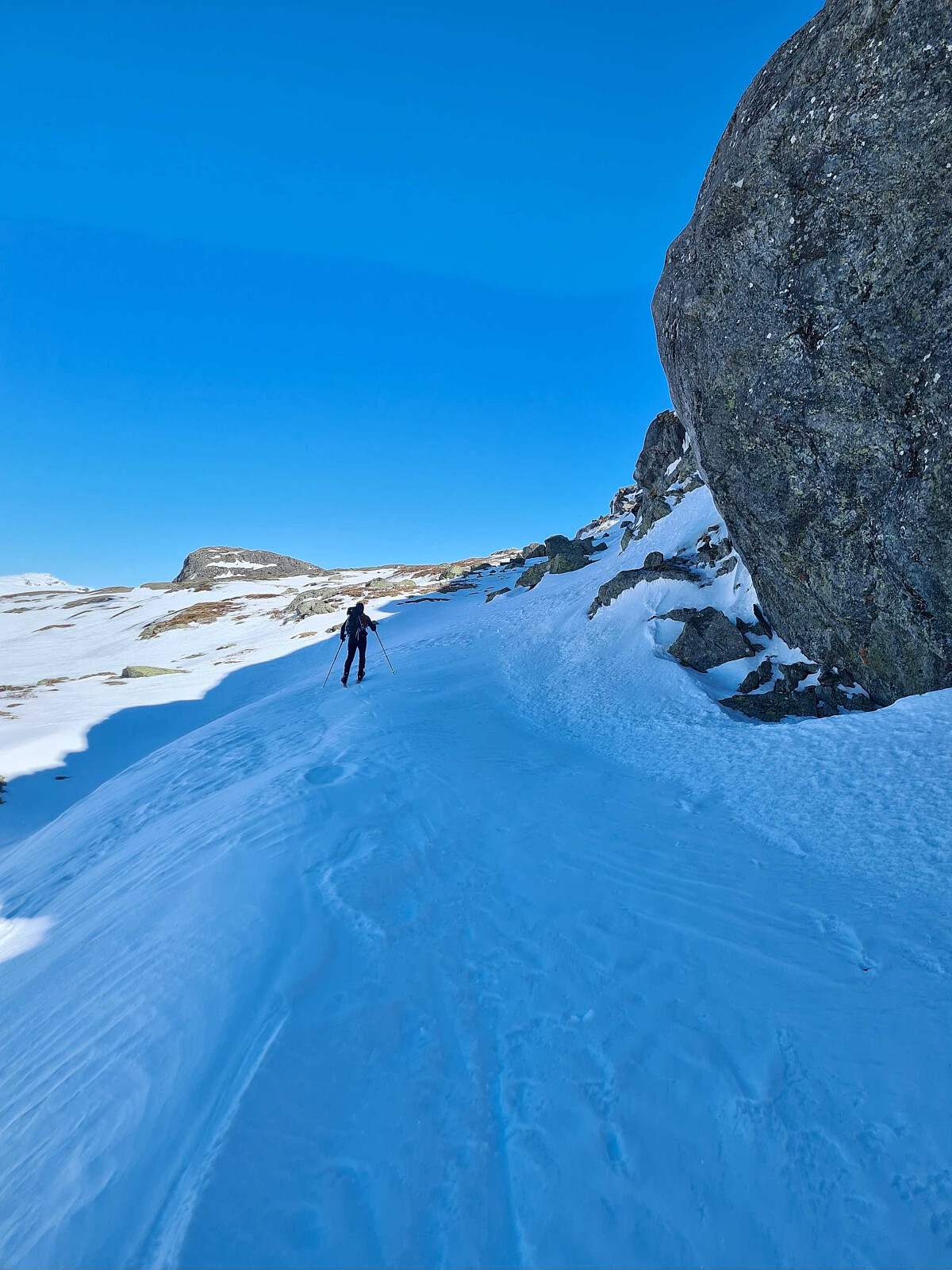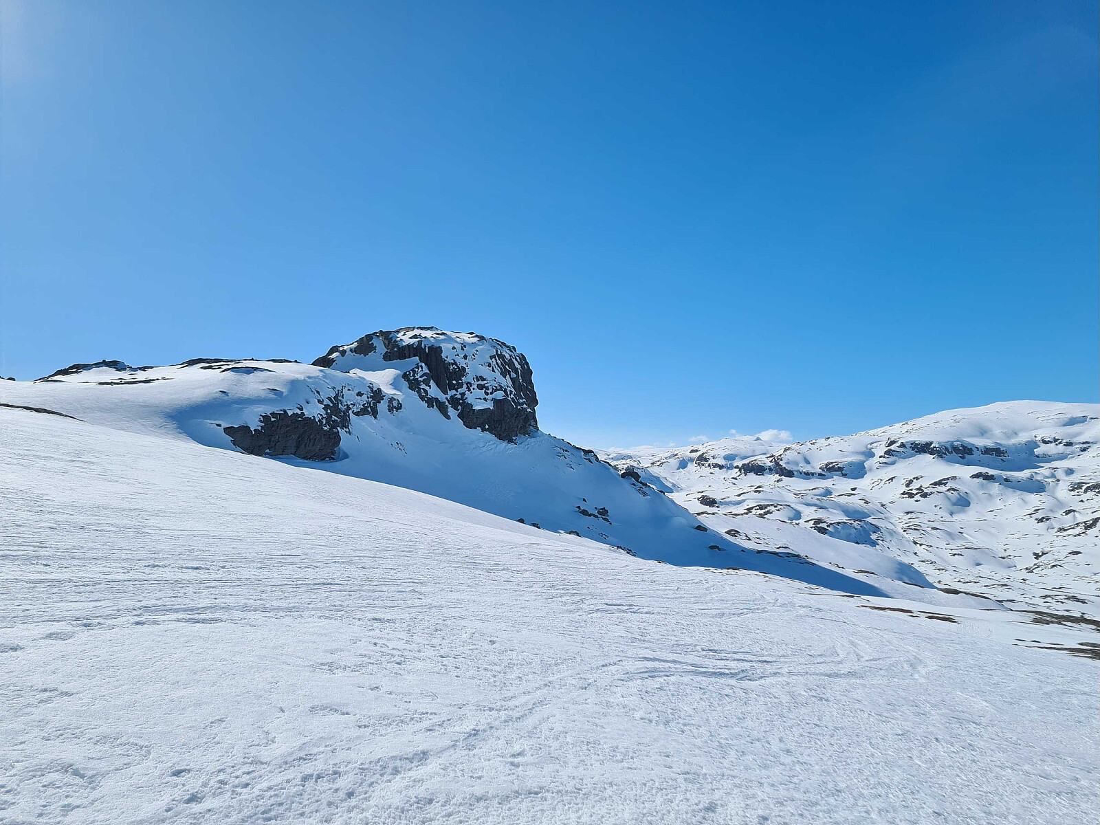 Turen ned på fjellski var litt utfordrende siden det var knallhard skaresnø. Det hadde vært gøy med randoski ned den fine bakken fra toppen. En annen utfordring på denne turen er navigeringen. Det er mye terreng. Bratte skrenter, stup, fonner, skard, skavler, småtopper og uoversiktlig geografi. Her bør man være forsiktig og ta det med ro. Hvis man ferdes her i dårlig vær med liten sikt bør man være god med gps, kart og kompass! Men det beste er å være her på en godværsdag slik som denne!