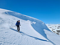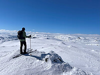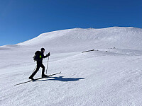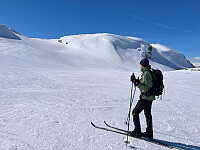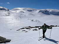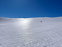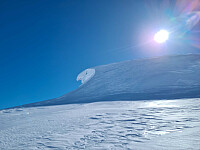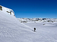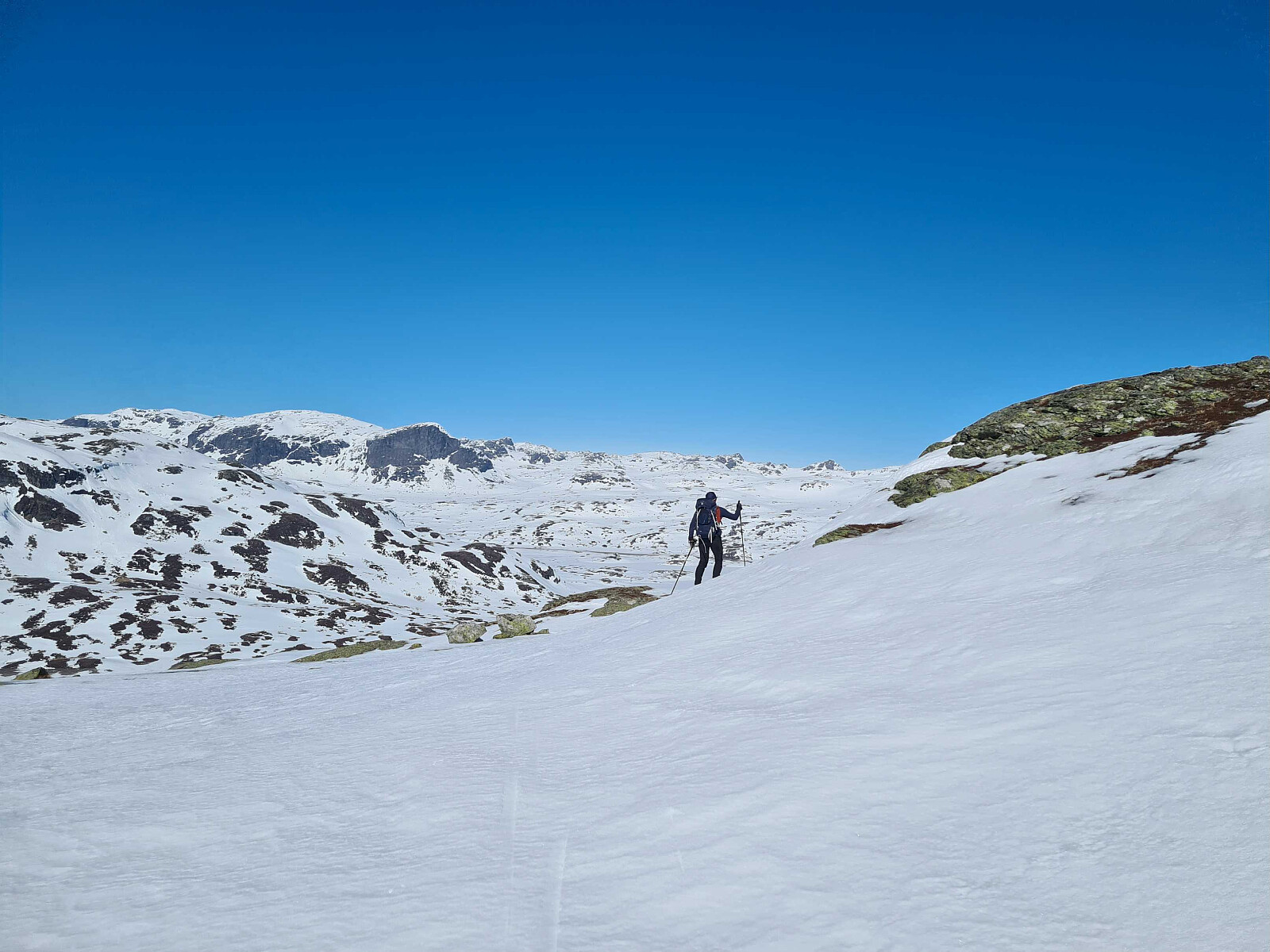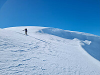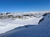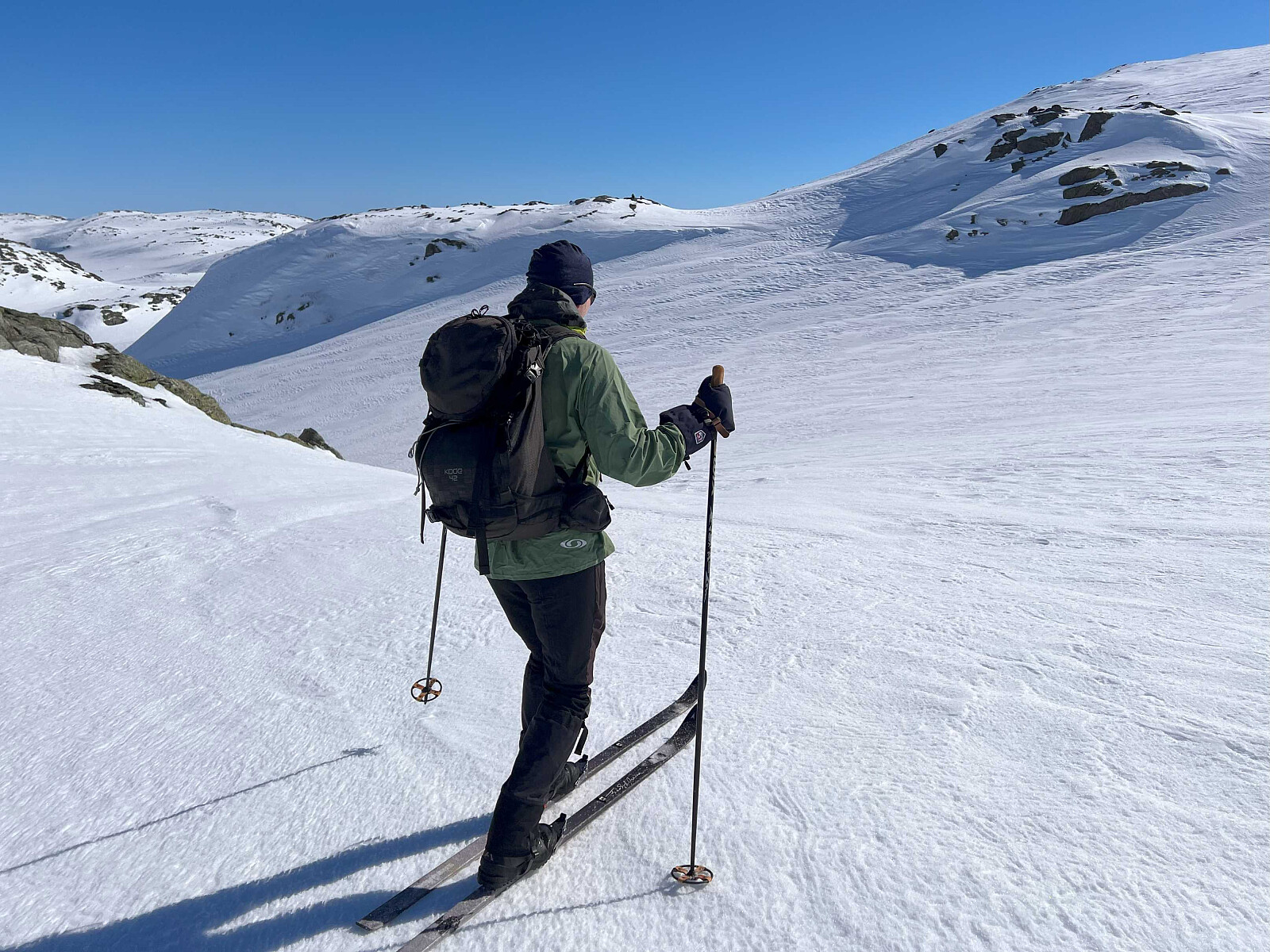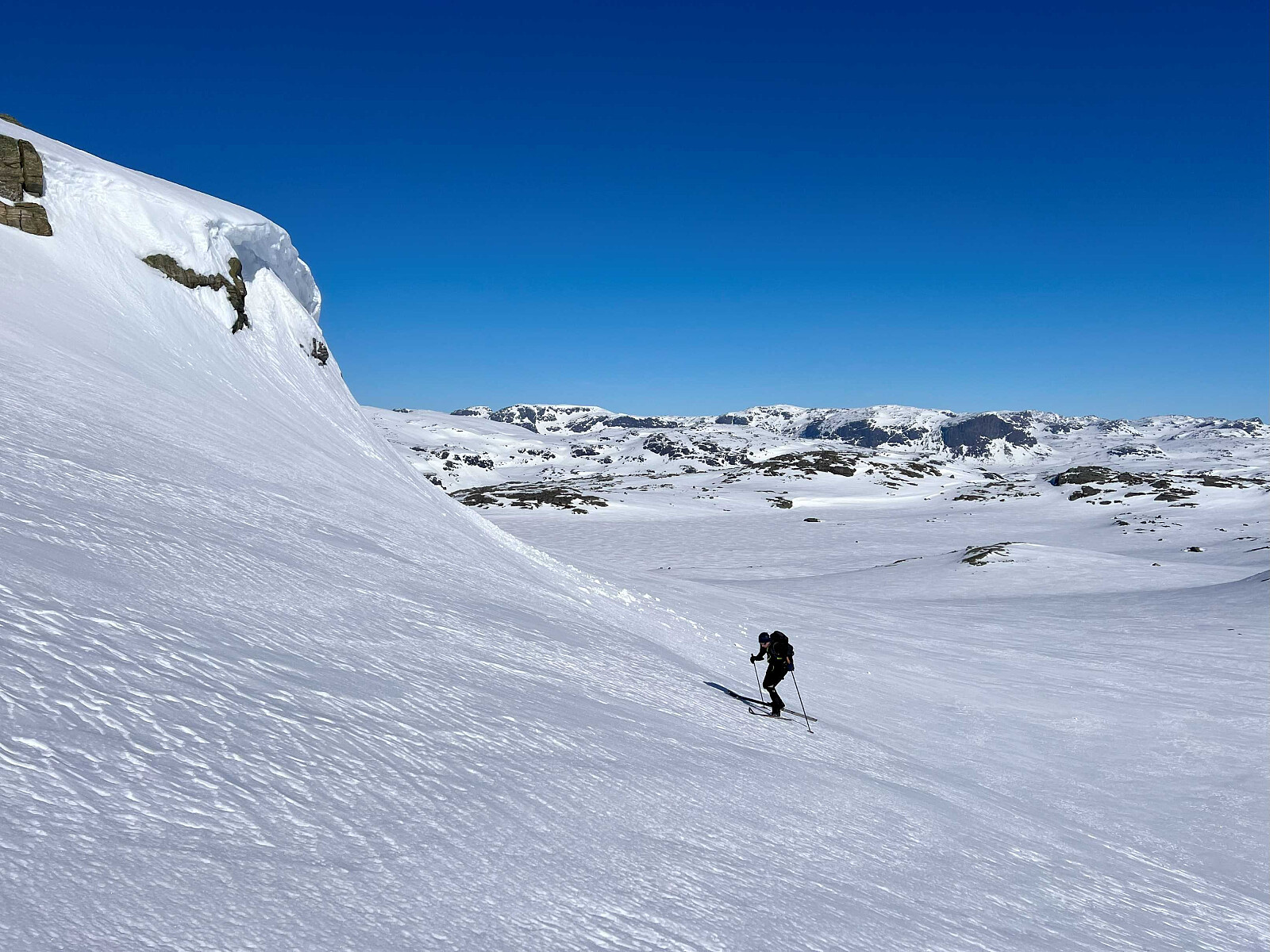 Turen ned på fjellski var litt utfordrende siden det var knallhard skaresnø. Det hadde vært gøy med randoski ned den fine bakken fra toppen. En annen utfordring på denne turen er navigeringen. Det er mye terreng. Bratte skrenter, stup, fonner, skard, skavler, småtopper og uoversiktlig geografi. Her bør man være forsiktig og ta det med ro. Hvis man ferdes her i dårlig vær med liten sikt bør man være god med gps, kart og kompass! Men det beste er å være her på en godværsdag slik som denne!