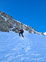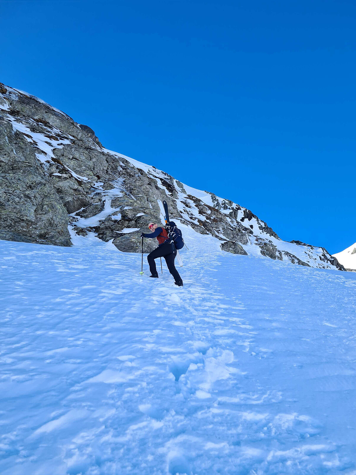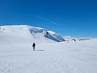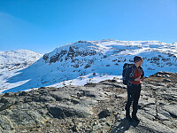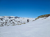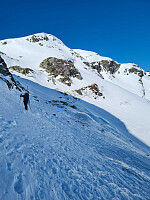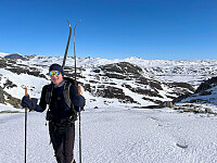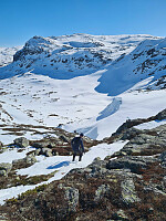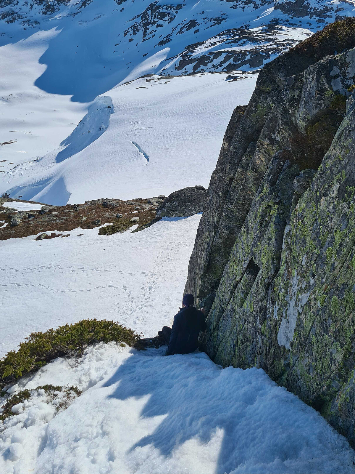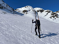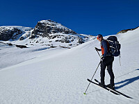 Vel over vannet tok vi på fellene og labbet videre opp Kistedalen. Vi fulgte sånn omtrent sommerstien på kartet. Lenger oppe i dalen lurte vi på hvordan vi skulle komme oss opp den bratte kneika der stien er merket mot sørvest på kartet. Vi så en varde på toppen av skardet som vi peilet oss inn på. Det så veldig bratt ut og midt i skardet var det et belte av is på tvers. Men vi fant oss en farbar og isfri vei oppover. Vi tok av skia og bar dem på sekken det bratteste partiet. Her var snøen hard og vi måtte sparke oss fottrinn for å komme oss opp.