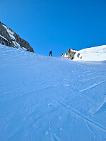 På veg tilbake mot fjellstua tok vi turen innom Kisteenden. Så måtte vi komme oss ned nok en fin bakke på hard skaresnø som hadde vært litt artigere med rando! Vi var godt slitne i beina da vi traverserte bakken nedover på nordsiden av Kisteenden. Fjellski og støvler gir liten støtte sammenlignet med rando og det merkes godt når snøen er hard og man må kante skia kontinuerlig i bratt terreng.