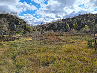 Turen gikk videre oppover bekkedalen mot Storetjødn. Det var et ganske myrete og vått terreng. Men det har vært noen dager med oppholdsvær så det var ikke så vått som det kunne ha vært. Det gikk helt fint å komme seg opp tørrskodd med gode fjellstøvler.