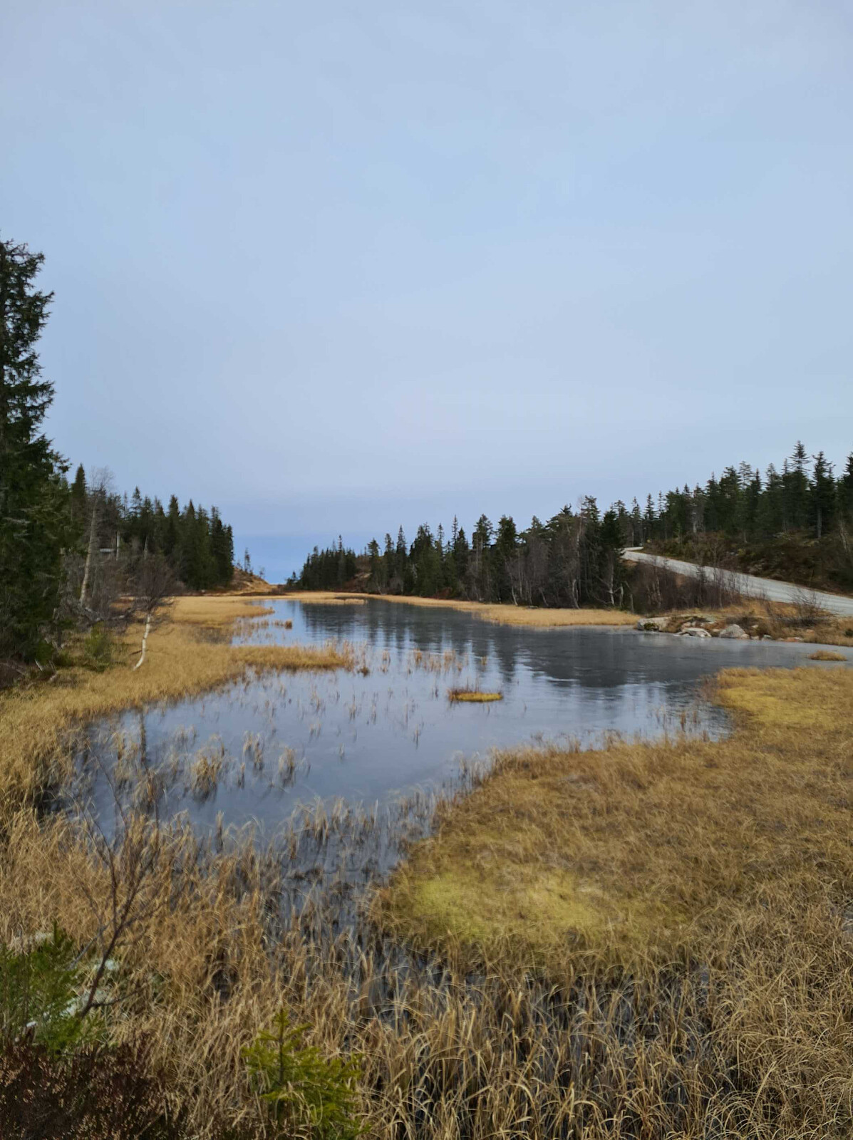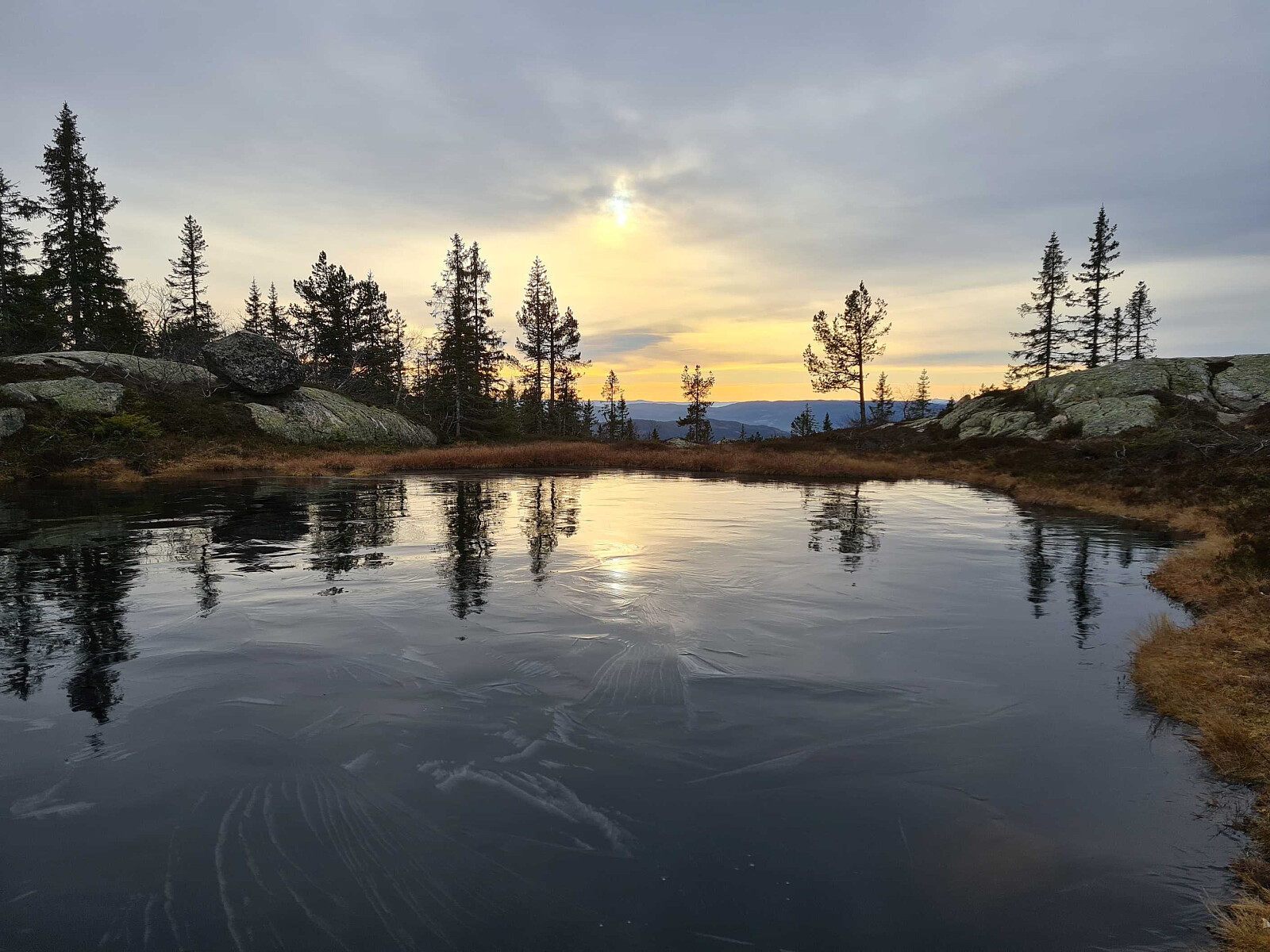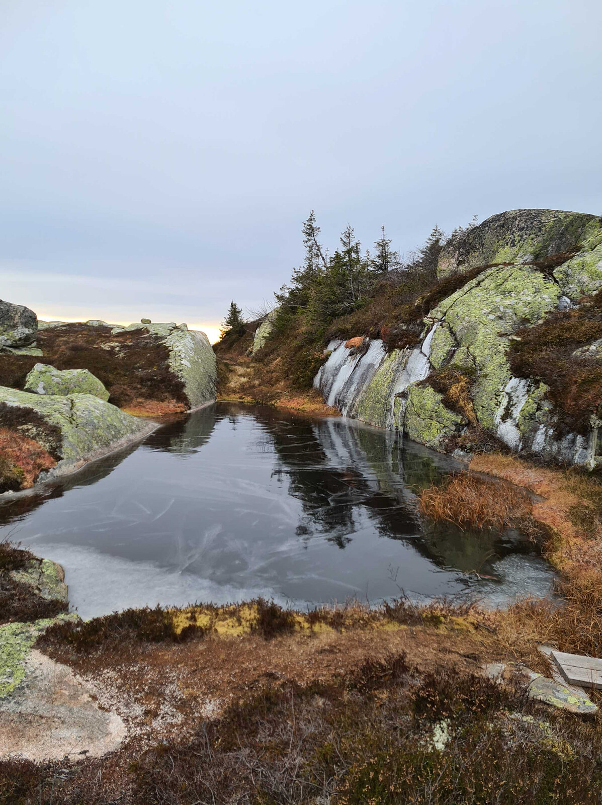 Kaldt, isende vind fra nordvest, frost i bakken og is på vannene.