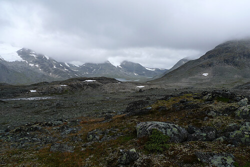 Noe av det fine med å samle PF10 topper er at det gir anledning til å gå om igjen på topper en har vært på før! Således også når det gjelder Semeltindene. Jeg hadde en nydelig tur dit sommeren 2010, men var den gang ikke klar over at det lå en lite kjent kamerat nede i sørflanken, like under Sørtoppen - nemlig Sørøst for Sørtoppen på Semeltinden! Denne var dagens primære turmål. Jan og jeg startet fra Leirvassbu litt etter kl 08. Vær og værmelding var bare så som så. Skyet hele dagen, endel nedbør, men lite vind. Det lå nysnø på toppene over 18-1900 m ved Leirvassbu. Vi startet i opplett vær og fulgte T-stien over Høgvaglen til omtrent midt på Langvatnet der vi tok av til venstre mot Urdadalen. Etter ca. 3 timer var vi klare for å starte oppstigningen.