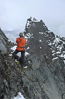På vei nedover mot denne fikk vi se toppen fra oven - bratt, eksponert og delvis dekket av nysnø - ikke akkurat ideelle forhold for bestigning av en slik topp. Etter litt sondering valgte vi å søke ned i sørflanken til hyllesystemet som er beskrevet av andre. Bratt og eksponert ned her på glatt nysnø. Jan rigget til standplass med tauløkke rundt den store steinen slik som Sondre brukte, og i tillegg en ekstra sikring i en fjellsprekk like over hyllen. Mens jeg sikret fra standplass beveget Jan seg forsiktig noen meter bortover glatte sva til han var oppe i selve skaret der det ligger en fastkilt steinblokk. Ny sikring her med slynge rundt steinen. Så fulgte et litt vanskelig opptak langs den første bergnabben fra skaret. Fjellet var vått av nysnø, og det var sparsomme tak. Etter litt kravling på magen kom han seg opp. Derfra var det rimelig greitt, men ganske eksponert videre opp mot selve toppen. Jan satte ytterligere to mellomforankringer på vei opp før han returnerte i den fri enden av det lange 60 eller 70 m tauet tilbake til standplass.