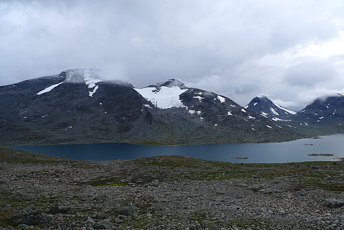 Vi fulgte et relativt slakt parti oppover med kurs mot Sørtoppen. Stort sett greit å gå her. Periodevis fant vi tråkk og småvarder som indikerte at vi var på rett vei. På vei oppover begynte det å regne, og svartlav.dekkete steiner ble såpeglatte. På 1900 m kom vi inn i nysnø. Snødybden økte på oppover mot toppen der den var 15-20 cm. Vi fortsatte opp på flaten ved 1978-toppen, og dreide så østover mot Sørtoppen. Det falt seg naturlig å gå helt opp til toppen av "gryten" mellom de to toppene før vi fortsatte mot