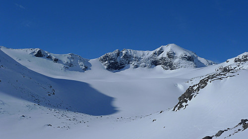 Ned igjen samme vei til Bukkeholsbandet. Her valgte Willy og Yngve å returnere til middag på Spiterstulen. Morten og jeg fortsatte fra Bukkeholsbandet NV-over Tverråbrean til