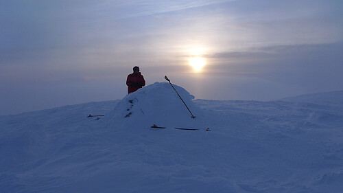 På ca. 1650 moh og ca. 3 km fra toppen satte vi fra oss sekkene og gikk mot toppen fra skaret mellom Gråhøe 1945 og Gråhøe 2014. Stort sett fint føre, men endel avblåst, skavlete og hardt mot toppen. Oppe ved den nedisete varden kl 1520. GPS som på PB 6882463 453500. Tåken hadde lettet litt, men utsikten var likevel dessverre nokså begrenset på selve toppen.