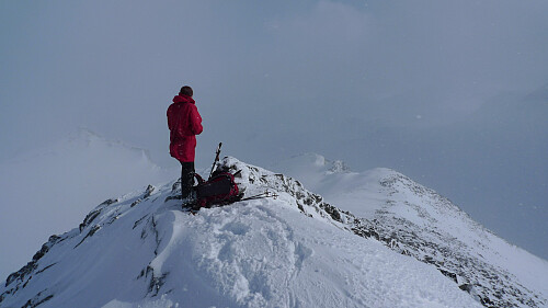 Vi forsøkte oss først oppover eggen. Etter en liten stund ble vi usikre på om vi ville komme oss opp langs eggen under de rådende vær- og føreforhold. For ikke å ta unødige sjanser søkte vi derfor ned i vestflanken under toppen, og her var det helt greit å ta seg opp. Oppe kl 16. Beskjeden, liten varde på GPS 6824385 471415.
