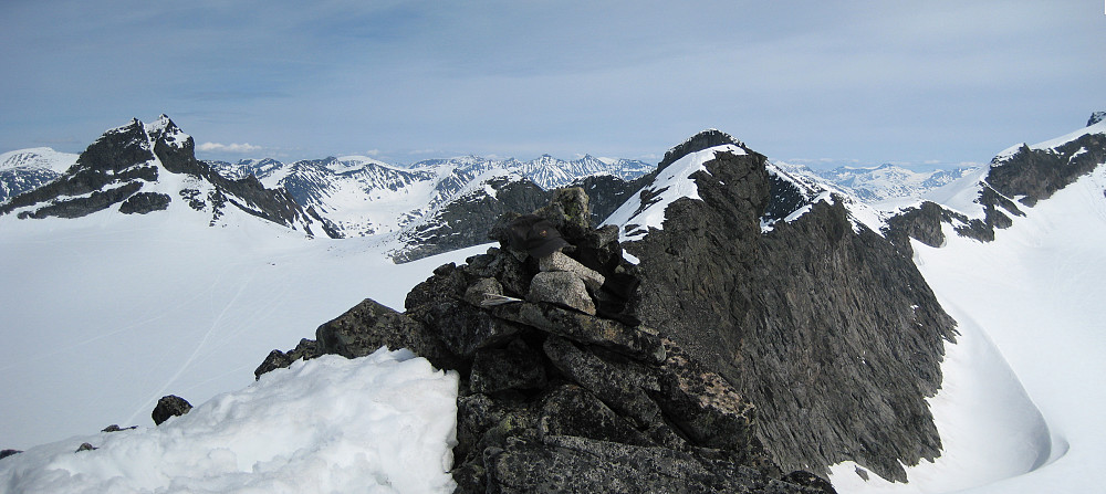 Jeg forsøkte meg først opp den anbefalte vinterruten i den bratte nordflanken. Jeg satte fra meg skiene, og fortsatte på skistøvler i gamle fotspor et stykke oppover. Men fotsporene førte ut på et isete og bratt sva som jeg ikke fant det forsvarlig å prøve meg på. Returnerte derfor til ryggen mot Veslebjørn der solen hadde smeltet snøen slik at det for det meste var tørt og fint fjell. Greit å komme seg opp her, ingen problemer å snakke om, bortsett fra et sted ganske høyt oppe hvor jeg måtte ned i et 2-3 m dypt skar (sannsynligvis samme sted som ruten i nordflanken kommer opp) før jeg etter litt strev kom meg opp igjen på ryggen og kunne fortsette til toppen.