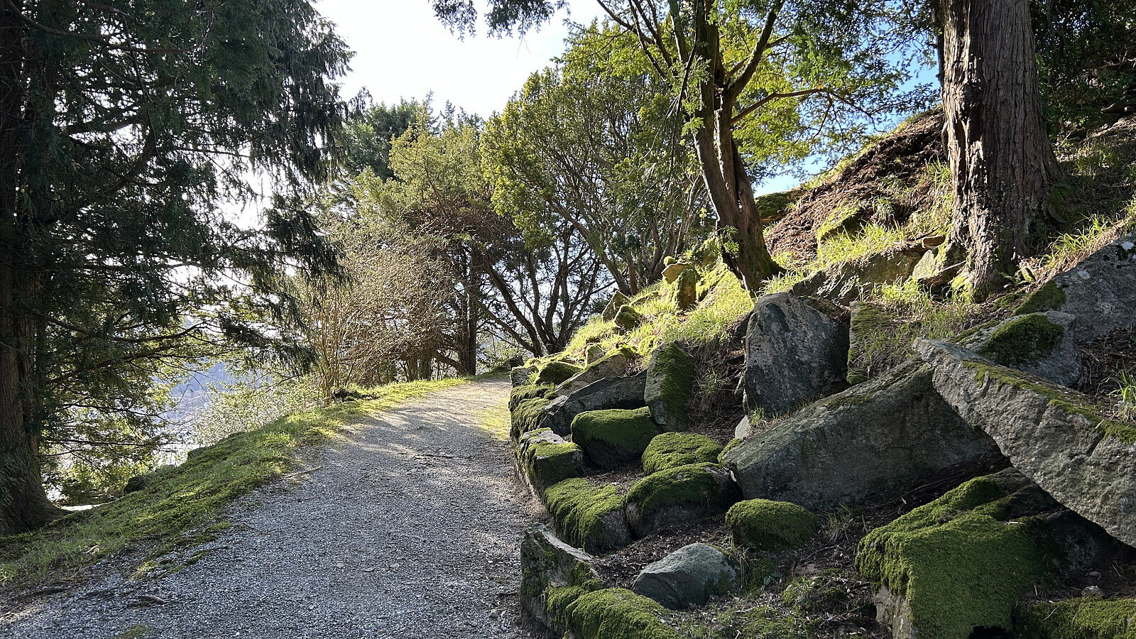 Retur til Åstveit. Vi gikk opp bakken til Snekkeplassen og fant en tilrettelagt snarvei som førte oss inn på det vakre natur/park-området NV for Jomfruhaugen. Ingen skilt som indikerte at dette er privat på denne siden.