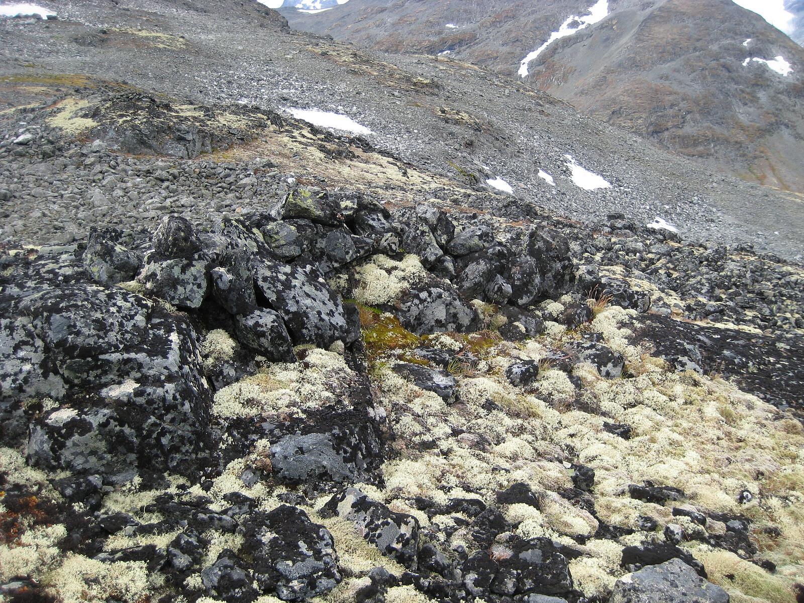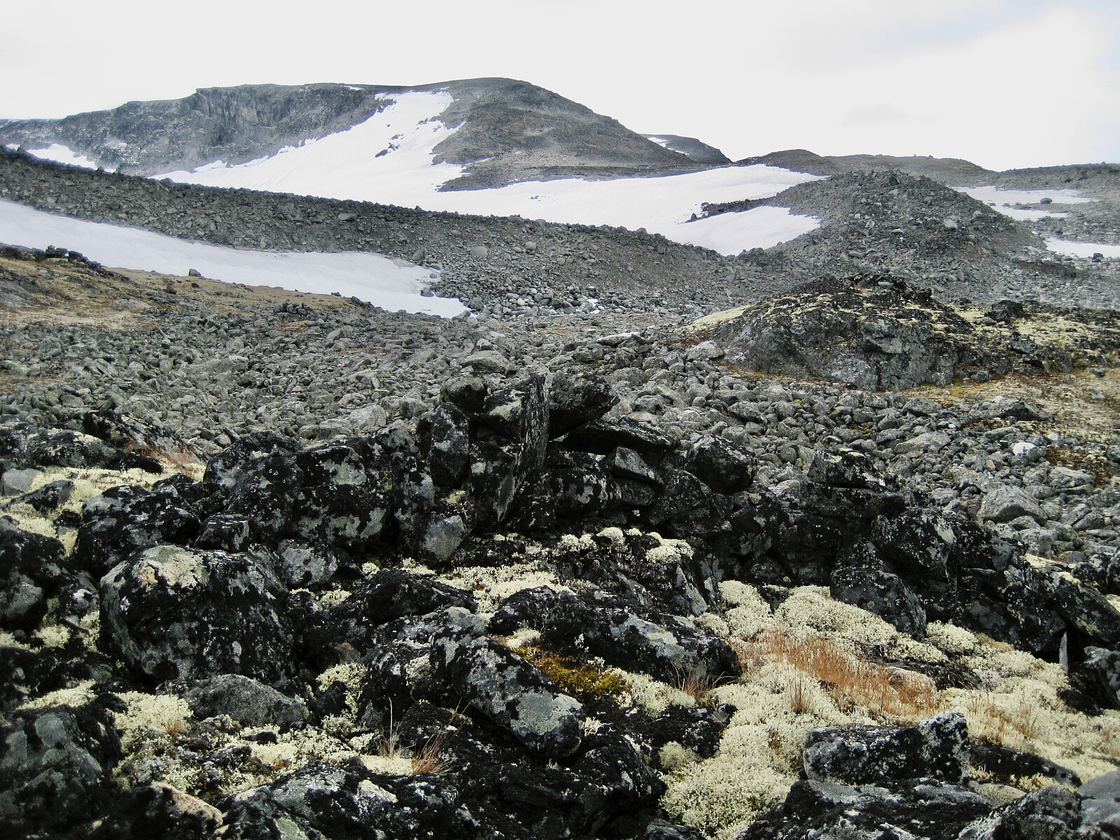 Tilbake til Leirdalen der det ble turstart fra Geitsætra kl 1130. Dagens mål var Nørdre Bukkehøe. Ikke det beste turværet denne dagen - gråvær og nysnø på toppene. Jeg fulgte vanlige rute, først opp langs Søre Illåe, krysset denne og fortsatte opp skardbakken til Svarttinden Vest. På vei oppover ryggen kom jeg over et sannsynlig bogestelle som ble brukt som skjulested under jakten på villrein.