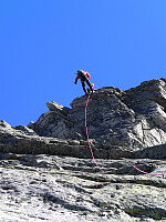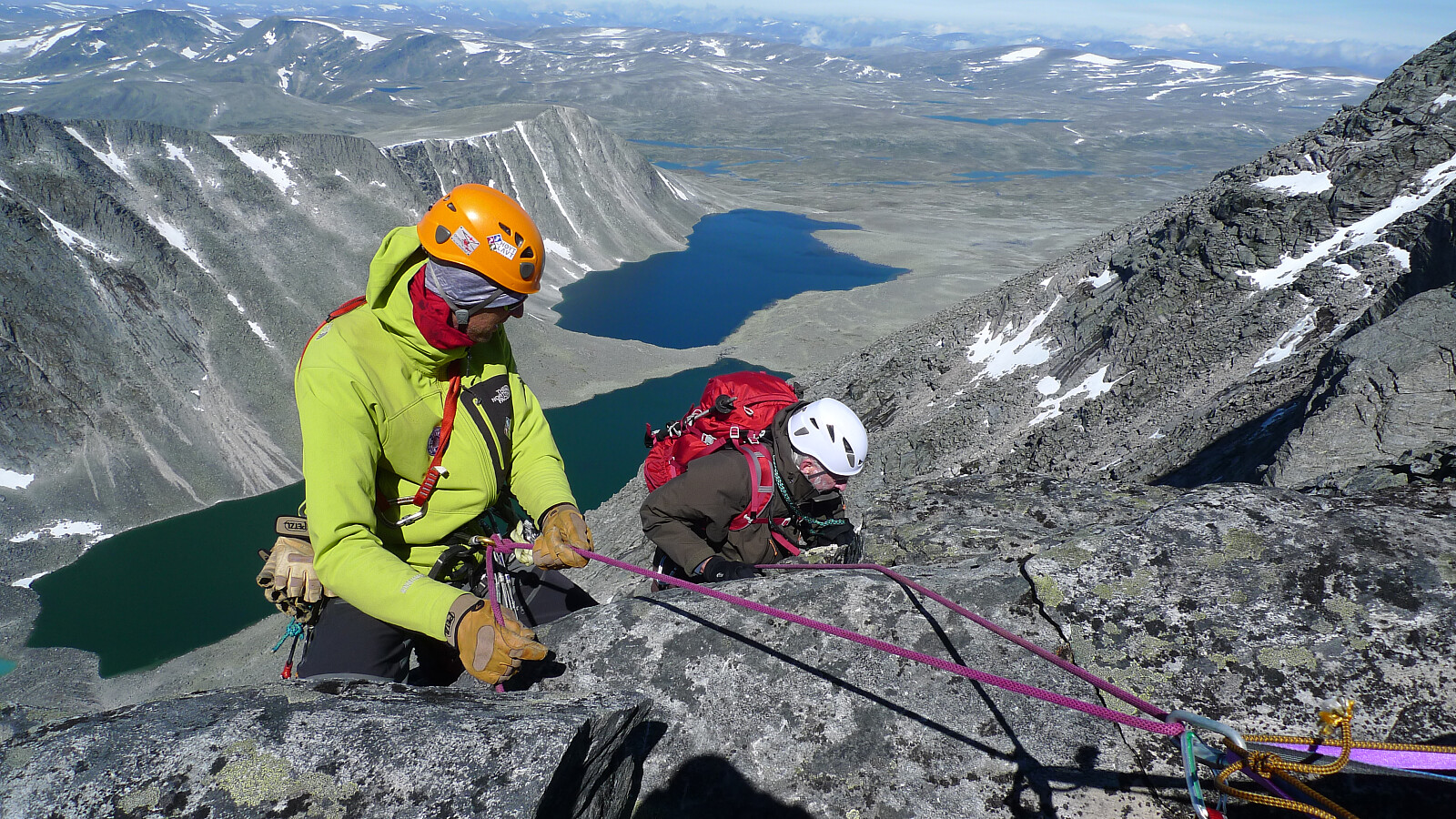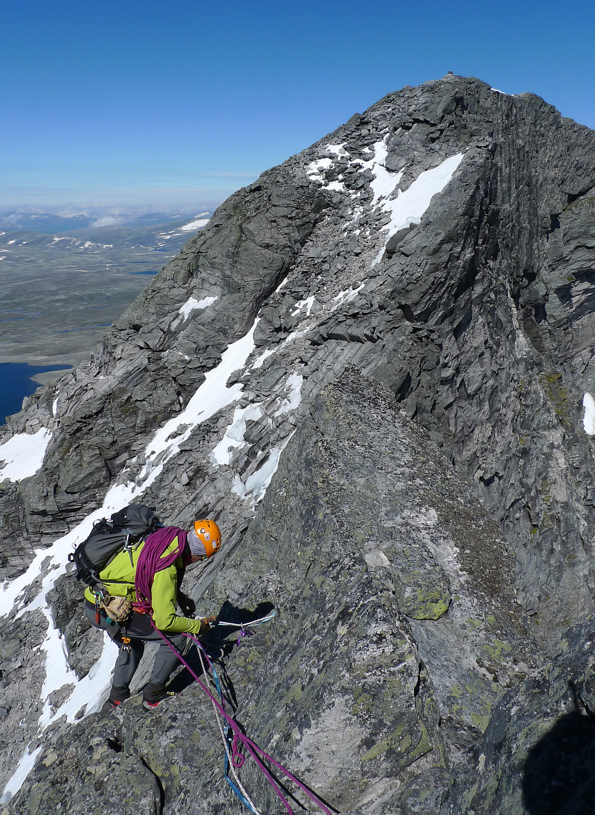 Skrevet av knutsverre 30.07.2013 21:22Fint at du likte bildet. Jeg hadde god tid til å fotografere mens Ole slet med å få løs tauet! Vi rappellerte slik at vi kom ned bare noe få meter fra skaret, og det var helt greit. Skjønner at vi var usedvanlig heldig med været når jeg leser rapporten fra SturlaS fra 28.7!!