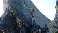 Ole gikk først mens jeg sikret ham på taubrems. Han satte en mellomforankring, og var raskt og effektivt oppe på den store skråhyllen under toppen. Pål og jeg startet klatringen i hvert vårt tau sikret av Ole på standplass. Fjellet var tørt og fint, og klatreforholdene optimale, bortsett fra vinden som var sjenerende, men ikke utgjorde noe egentlig problem. Vi kom oss begge greitt opp ved egen hjelp, men det siste stykket opp mot hyllen var det sparsomt med valgmuligheter og gode tak. Jeg ville aldri gått opp her uten sikring. Klatringen var bare moderat eksponert trygt vekke fra stupet på høyre side, men takene der vi gikk opp var såpass små at jeg opplevde ruten som nærmere Grad 4. På vei oppover traff vi fire andre klatrere som hadde gått traversen motsatt vei av oss, og som nå var på vei ned i skaret øst for Vesttoppen. Øverst på hyllen var det et lite overheng som måtte forseres før vi var oppe i lett klyveterreng opp til selve toppen der vi var fremme kl 14. GPS 6909514 513028.