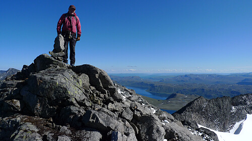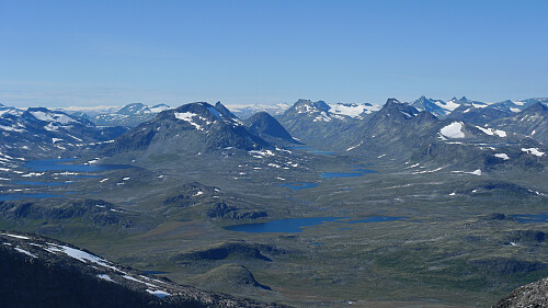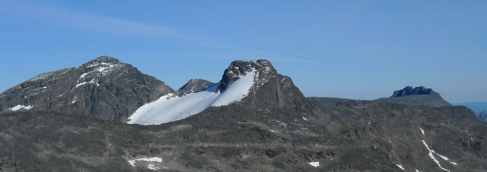 Vi fortsatte nå nordover ryggen i lettgått terreng og kunne nyte flott utsikt mot toppene vi hadde besøkt dagen i forveien (Svartdalspiggene, Langedalstindane og Mesmotid) i tillegg til vidt utsyn over Jotunheiemen fra Falketind i vest til Glittertinden mot NNØ. Ca. 100 hm ned fra Nørdre Slettmarkhø kom vi til dagens nest siste topp