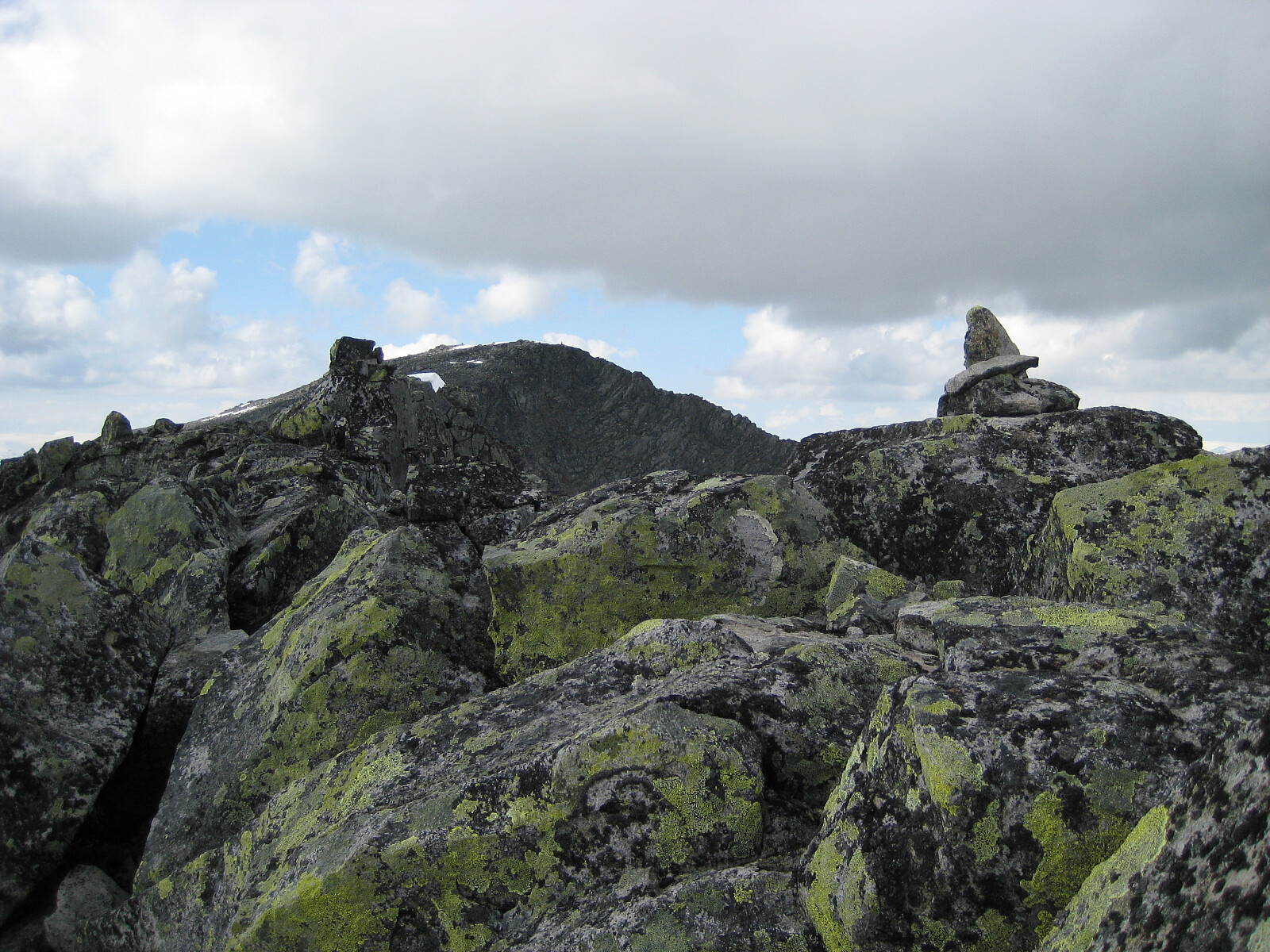 23. juli 2009. Start fra Spiterstulen ca. 0930 i lett regn og noe tåke, men for det meste brukbar sikt. På vei opp mot Veoskardet ble det kraftigere vind og sluddbyer. Nysnø over 2000m. Fra Veoskardet gikk jeg sørover til 2264 toppen nord for vesttoppen på Store Memurutind. Her var det markert en nedgang til den meget bratte og løse østsiden av fjellet ned mot passasjen over til Veobreatinden. Det var lite eller ingenting igjen av breen over mot Veobreatinden, og helt uproblematisk å krysse over her. Oppe på toppen kl 1630. GPS 0472942 6827470. Begrenset utsikt på tåke og lavt skydekke, men det ble da glimt utover Veobrean i perioder. Tilbake samme vei. På tilbaketuren gikk jeg bortom småtoppen Leirhøe Sør hvor jeg var oppe litt over kl 19. Så ned igjen Veoskardet på glatte >>>