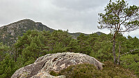 Etter turen til Storerinden kjørte vi vestover på Hausdalsvegen til mellom nr 425 og 435 der skogsveien sørover mot Sagelva starter. Fulgte den til NØ-ryggen av Rustene der vi fant brukbar sti som førte opp til topp-området. En del trevelt som måtte omgås.