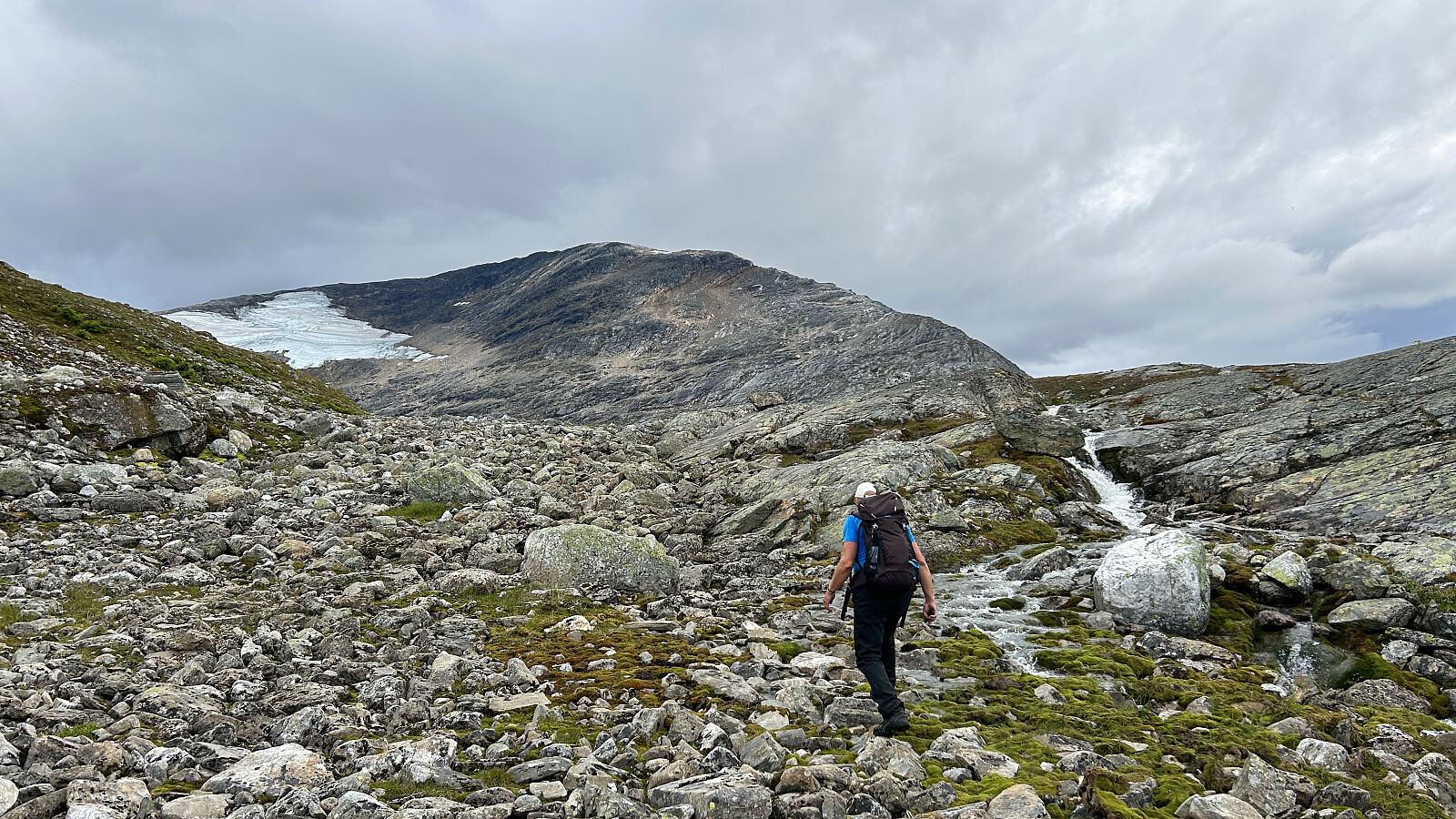 Vi gikk den vanlige ruten på vei og sti til Laksevåghytten . Fortsatte inn Espedalen før stien dreier bratt nordover før den igjen går vestover og kommer inn på den vanlige stien mellom Viggohytten og Gravdalsfjellet. Fin utsikt fra fjellknauseni dette området - se bilder under.