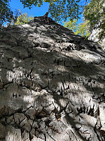 Juan tok oppvarminga i botnen av veggen - ei litt begrodd rampe som førte til starten av bratta. Det burde jo vere enkelt - men det vart litt klatring her også. Som sagt begrodd, men også laust. 3+/4- ish