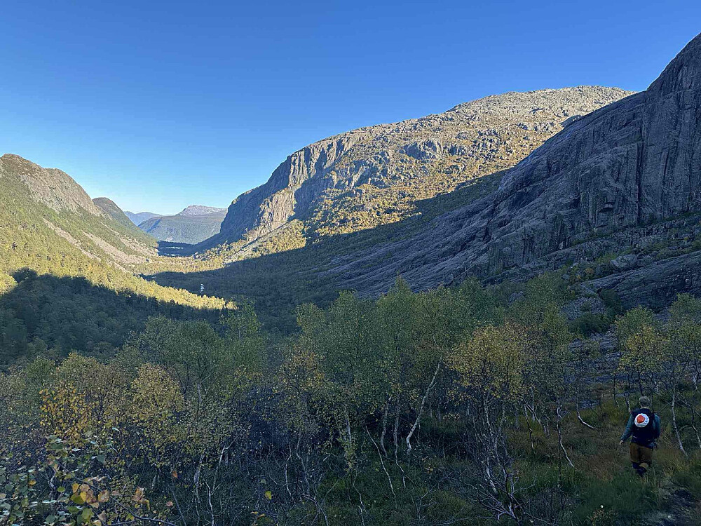 Vi gikk for linja vi hadde sett på sist - eit flott dieder og riss midt i veggen. Alltid krevjande å vurdere brattheit og vanskegrad frå bakken. Så det var berre å prøve. Min plan var at vi gikk ei rute, kanskje 3-4 taulengder, tok lunch, og så ei rute til. Slik gikk det ikkje.