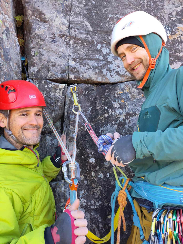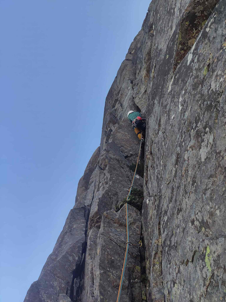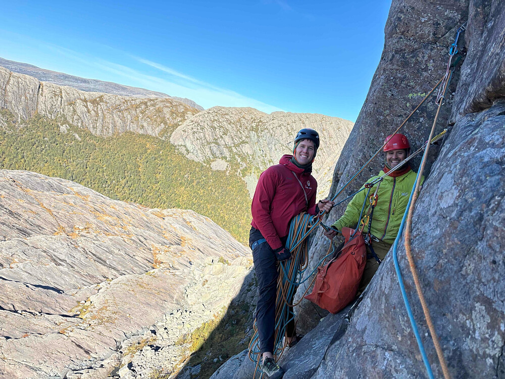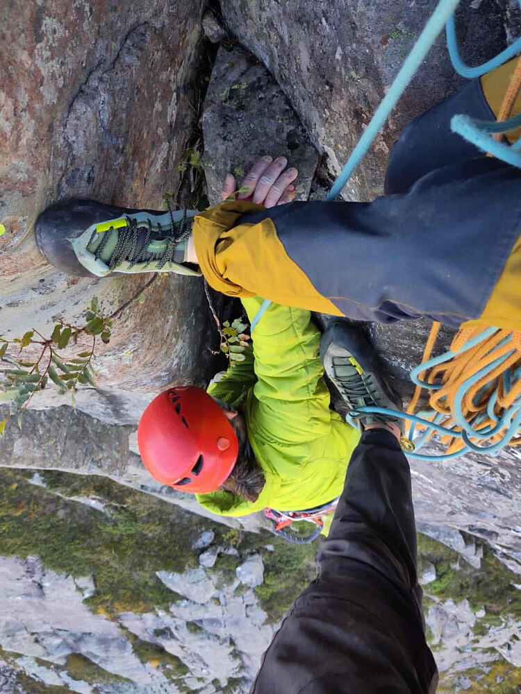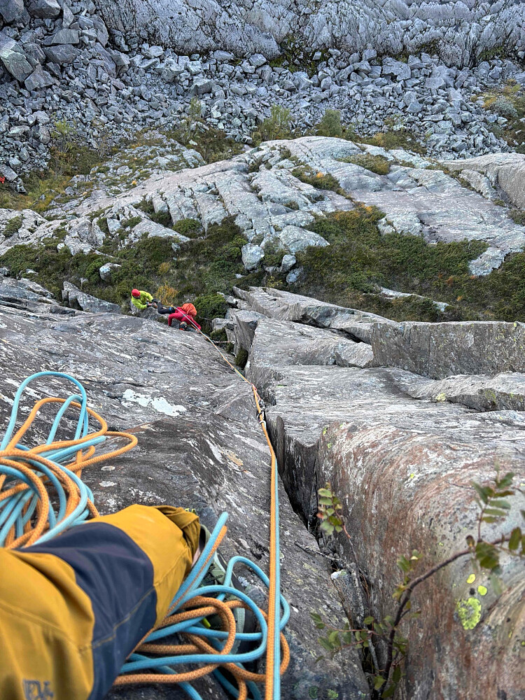 Etter ein morsom og intens kamp drog eg meg opp på det vi trudde var ei standplasshylle, men som i staden var eit lite hjørne som var bittelitt mindre vertikalt enn resten. Sette standplass, og lurte litt på korleis dei to andre ville ta dette opplegget. Aslak klatra med sekk, og det var tungt nok, men med gode jammar kom han seg opp. Juan måtte raskt konstatere at han må klatre fleire riss. Nokon fall vart det, men dei kom seg opp. Sosialt på standplass for å seie det slik.