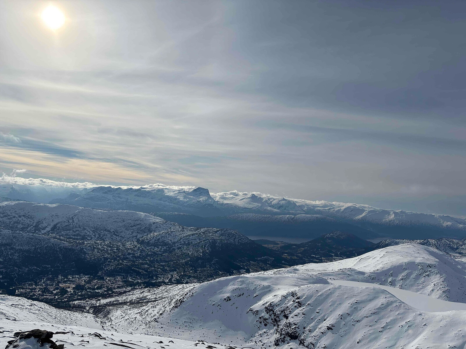 I dag var brått heile familien opptatt med andre ting. Så då måtte jo 10 grader og sol brukast til eitvart. Einaste plassen i nærleiken med snø er Furehogane, så då vart det Ljosuregga. Gjorde meg nokon tankar opp dalen, og sjekka snøen på veg opp. 5 cm nysnø, så var resten vått. Her var det moglegheiter. Sjekka igjen på toppen - like smelteomvandla. Så då vart det sørflanken. Vedvararande 30-40 grader utan trygge stoppestader 400 hm. Var jo litt spennande.