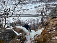 Klara å skvise inn enda ein tur opp Holvikefossen før tøværet tok for hardt. Denne gongen var Aslak med. Litt varmare i trøya denne gongen, tok høgresida som er litt brattare. Med litt oppsøkande klatring vart dette WI4. Smøris og flotte saker om enn til tider litt bløtt. Morsom klatring - deilig å kjenne at ein slappar av i bratta igjen. Kanskje finaste tur opp fossen for meg dette. Tre taulengder, 3.5timar bil til bil. Slettes ikkje dårlig.