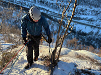 Klara å skvise inn enda ein tur opp Holvikefossen før tøværet tok for hardt. Denne gongen var Aslak med. Litt varmare i trøya denne gongen, tok høgresida som er litt brattare. Med litt oppsøkande klatring vart dette WI4. Smøris og flotte saker om enn til tider litt bløtt. Morsom klatring - deilig å kjenne at ein slappar av i bratta igjen. Kanskje finaste tur opp fossen for meg dette. Tre taulengder, 3.5timar bil til bil. Slettes ikkje dårlig.
