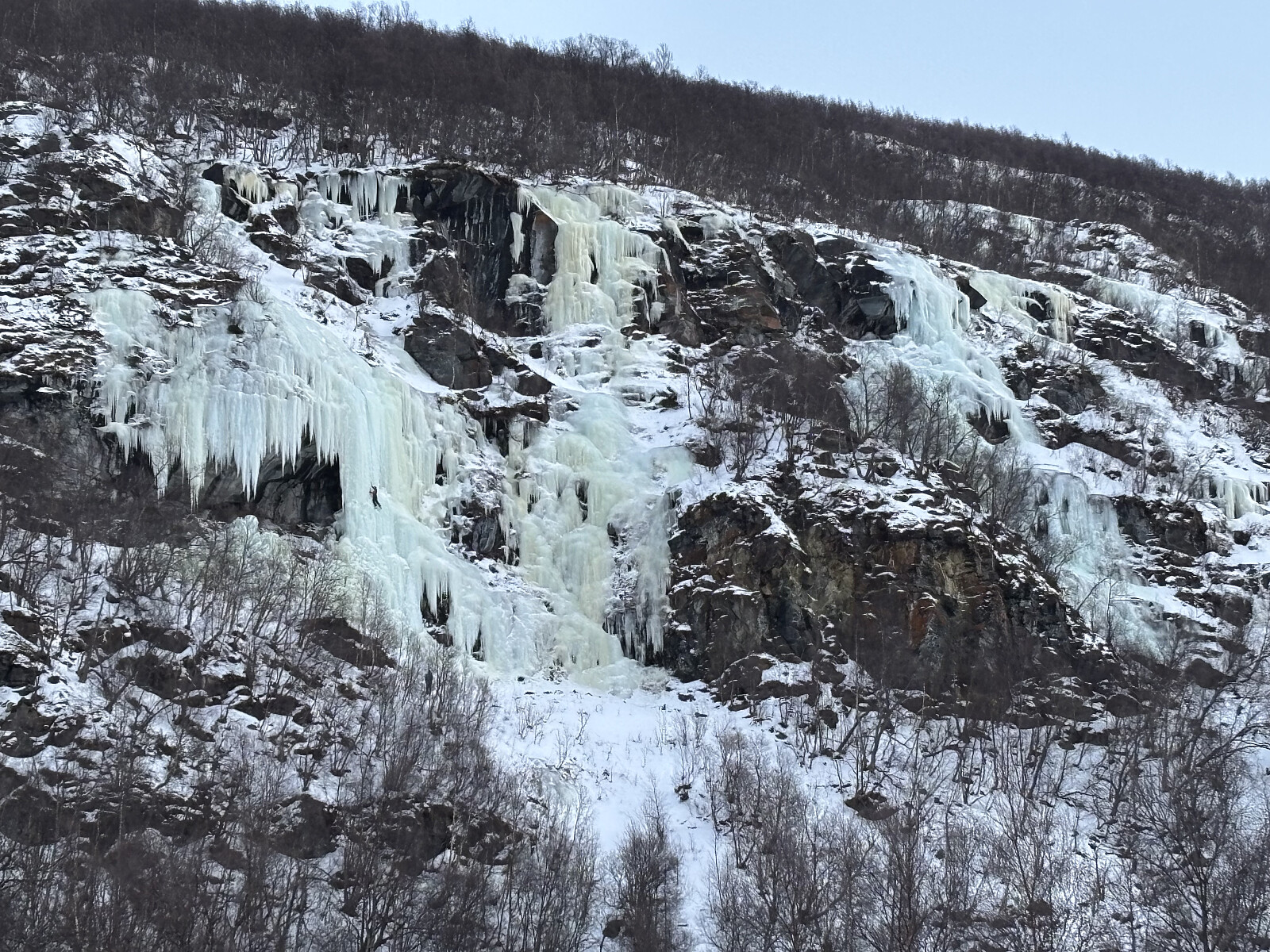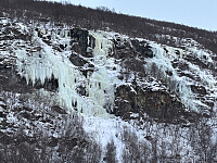 Bra kaldt på parkeringa og innsteget. Fossen var fullt forma og utan snø. Eg starta og tok det litt rolig (fossen er stor og kan gåast med litt ulik vanskegrad). Tok den i tre lengder i dag så det vart litt kortare å vente på standplass i kulden. Drog første lengdee. litt mot venstre og sette stand etter 30 m, ca WI3 og smøris. Jesper kom etter og gikk det litt slakare mellompartiet, med litt oppsøkande klatring. Så var spørsmålet om eg skulle prøve meg på den bratte venstrevarianten eller den slakkare høgrevarianten. For bratt for tynt for svak - det var høgrevarianten. Og den var ikkje så slakk som den brukar >>>