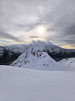 Første dag i Lofoten. Sto opp kl 04.00 for å rekke et værvindu. Det ble helt perfekt. Fikk sikt til havet på begge sider og godt lys å kjøre i. Alle var fornøyde. Haugevis med utenlandske guida lag som la i vei oppover når vi kom ned. Akkurat da kom regnet. Følte oss lure da. Med Ina. Brukte stegjern opp store deler av turen da elevene seilet rundt på glatta.
