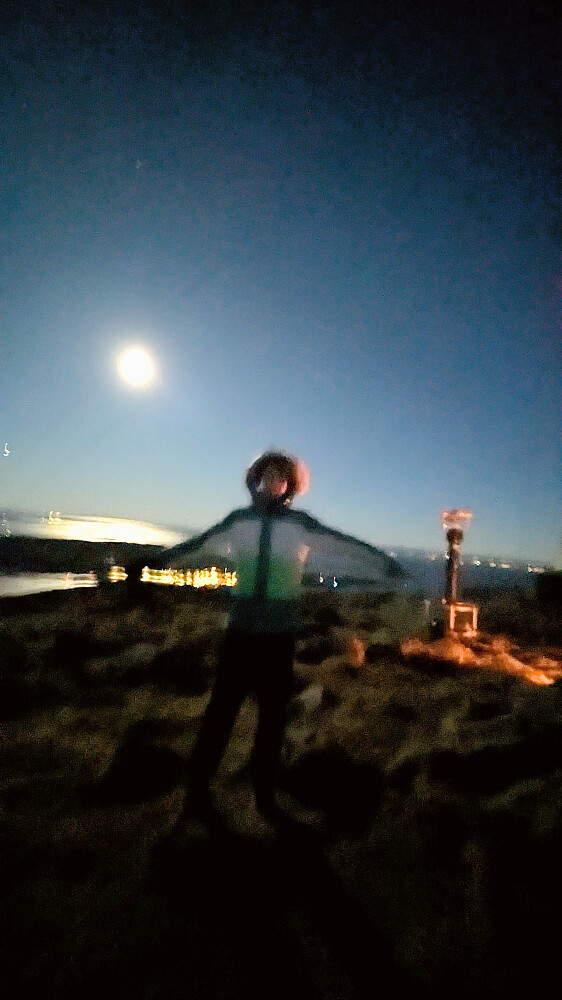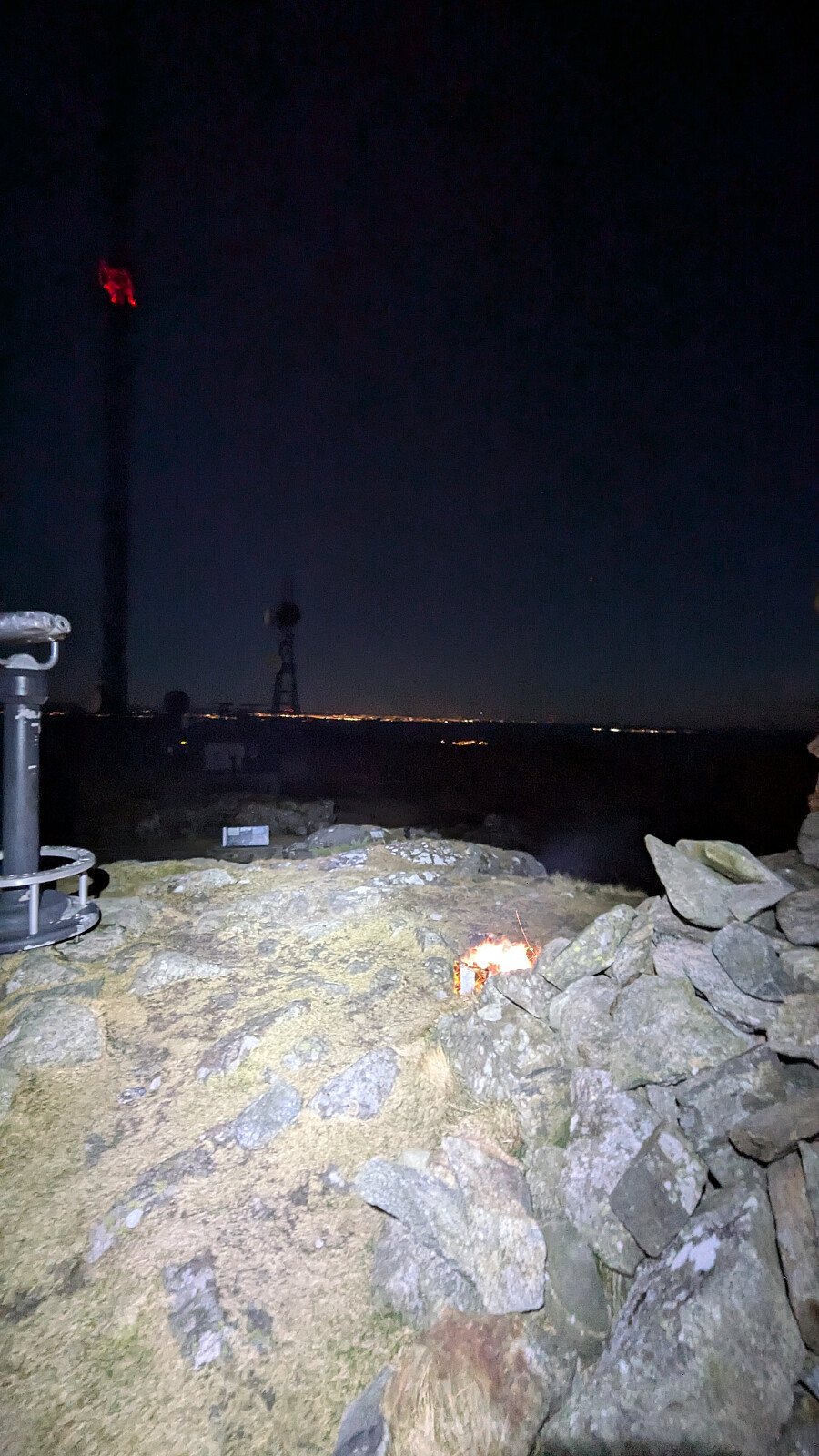 Fin beinstrekker på veien nordover. En ATV kjørte oppover rett før oss. De fyrte av et batteri med raketter på toppen og suste ned igjen. Da vi ankom toppen, lå restene og brant ved varden, sikkert ikke helt innafor regelverket...