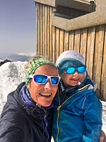Fikk oss en god stopp på toppen med litt leik, mat og moro med rumpeakebrett. Der satt det et par kjenninger som hadde gått opp med truger. Føret ned var greit men uten den beste gliden. Vinjar sang og storkoste seg nak i pulken som han pleier og kjeftet når jeg bremset for mye :-) Nok en strålende dag i voldsom flott >>>