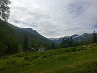 Ove og meg var så heldig å få lånt en sykkel med Bjørn Filipsveen fra Surnadal og det er godt å ha når man skal innover Vinndøldalen de ca 6 km til Korsbekken hvor jeg startet turen. Jeg hadde lest på et eldre innlegg på fjellforum at det skulle være en lettgått sti inn til Eiterdalsæter. Denne fant jeg ikke da jeg travet langs elva en liten stund, men endte opp med etterhvert å følge et kyrtråkk på høyre side oppover langs elva. Her var vegetert og forferdelig varmt og trykkende i dag. På grunn av hissige klegg allerede da jeg parkerte sykkelen, måtte jeg ha på meg den letteste vindjakka mi, men jaggu beit kleggen gjennom den også opptil flere ganger! Passerte mye molter men måtte la fristelsen ligge. Ingen stopp ble gjort til jeg var kommet meg opp over skoggrensa. >>>