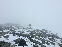 Mye våt snø fra 930 m og oppover. Vi hadde været på vår side helt til vi nærmet oss skaret mellom Grøtdalstinden og Urkedalstinden. Da kom skodda sigende og gav oss ikke mange meter sikt! Da blei det grauttjukt. Det var like før vi snudde der, for vi så bare hvitt rundt oss og hadde ingen holdepunkter i terrenget. Mitt forslag var å prøve opp mot Grøtdalstinden først og håpe at sikten bedret seg. Dette gjorde vi, og etter litt trasking i totalt whiteout, fikk vi se litt av den steinete ryggen mot Grøtdalstinden. Det gikk veldig fint oppover fordi vi hele tiden så terrenget forann oss. Ingen sikt på toppen >>>
