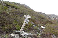 Etter en fin tur på Saksa var jeg sjølvsagt klar for ny tur når været fortsatt var rimelig greit. Kjørte inn Settemsdalen og fulgte denne skogsveien opp til ca 215 moh. Her var rødmerket rås videre først på traktorvei og deretter over på sti. Denne stien går også mot Tverrlihytta. Flott og godt merket sti som raskt tok høyde, helt etter min smak :-) Stien er godt vedlikeholdt med mange skiltede stedsnavn underveis. Hadde fin sikt mot toppen helt til siste 100 høydemeterne, da la det seg skodde nedpå og jeg merket antydningen til noe nedbør i lufta. Da traff jeg plutselig på en kar som for forbi meg nedover og fikk slengt utav seg "det skjnøa på toppen" før han hastet videre... :-) og det gjorde det jaggu. 13 juni og store snøfiller i lufta. Brukte litt under en >>>