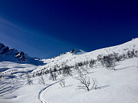 En strålende dag men med en isende kald nordavind som var nokså bitende i høyden. På toppen fant jeg allikevel le av varden og kunne nyte en kosestund i sola før jeg satte kursen nedover igjen. Det var litt mer vind og solpreget føre i forhold til lørdagens herlige tur, men overkommelig og veldig kjekt uansett. Tok på fellene og labbet opp på Revureholten igjen etter Kvitelvebakkane for å få en ekstra nedkjøring og for å se om denne solvendte siden kunne være hakket bedre. Den var litt vekslende i starten men ellers ganske bra. Idag fikk ikke sola varmet tilstrekkelig opp de harde snølagene grunnet kaldere temp og kald vind. Men, alt i alt nok en fantastisk skidag :-)