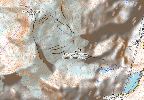 Taxi-turen opp til Zongo Pass (4800m) tok vel en time i nattemørket, og med hodelykter tente, begynte vi vandringen kl 23:15. Det gikk ganske raskt oppover stien til hytta (5200m), som vi ankom kl 0:35. Der viste det seg å være fire små grupper som overnattet, alle med hver sin lokale guide. Noen av disse var nå allerede stått opp og var igang med å gjøre seg klare. Vi ble værende i hytta i omlag 1.5 time for å spise vår medbrakte niste, samt få oss litt hvile før vi begynte på neste etappe oppover.