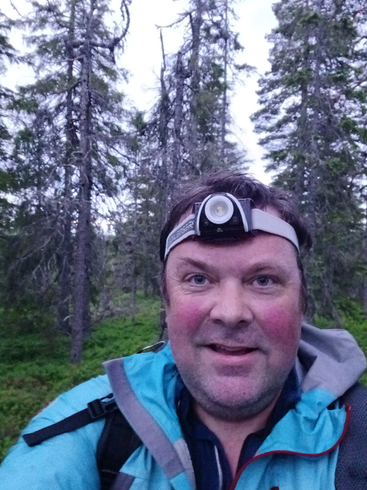 Peakbookappen fortalte om 900 meter i luftlinje. I skumringa kl 22 var terrenget krevende nok å bevege seg i særlig for meg med få slike turer i det siste. Noe steinete og hull oppover og noen myrer før vi kunne juble på toppen av den 541 meter høye Håkensbrenna. Anne fant smågodtpåsan og jeg varta opp med Singo uten sukker.