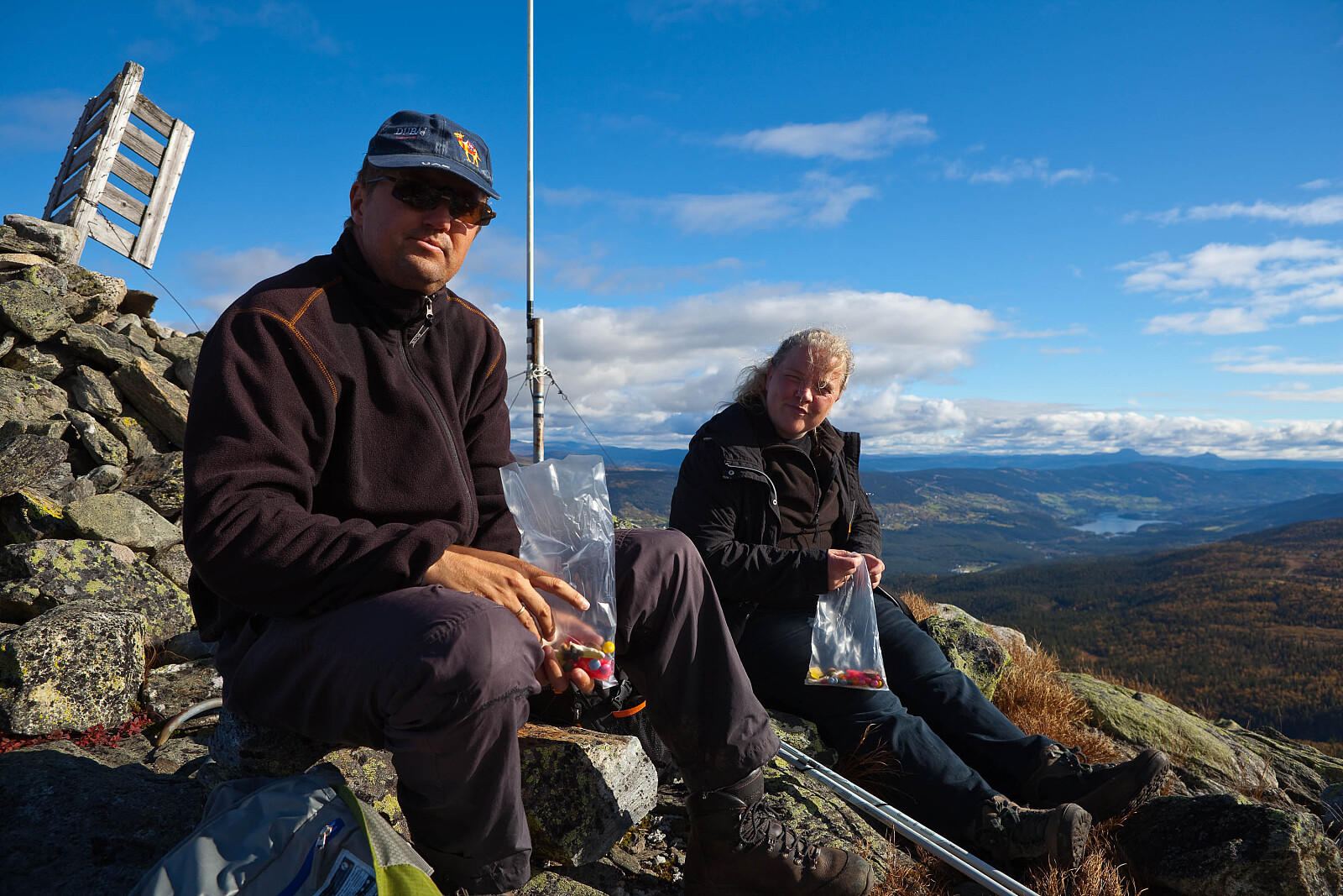 Etter en liten pause ved trevarden bar det bort til høyeste punkt, like ved mobilmastene som skjemmer den ellers fantastiske utsiktstoppen litt. Usain Bolt var inspirasjon for poseringen på toppen, og mens Ole Petter bød på fruktige likører som toppdram, dro jeg godteposer opp av sekken. Litt feiring måtte vel være lov etter en såpass dugelig jobb. Spesielt emosjonelt kunne han ikke si det var, men i alle fall gøy og som bestilt fikk vi også en del sol under topp-oppholdet.