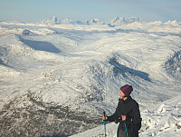 Etter en særdeles vellykket tur til Store Ringstind dagen før var det duket for nok en dag med knall vær! Vi våknet av de første solstrålene som traff teltet vårt nede ved Bøvertun. Etter en deilig frokost på gresset utenfor teltet gjorde vi oss klare til den 10 minutter lange bilturen opp til Krossbu. Parkeringen ved brua rett nedenfor Krossbu var allerede fylt opp av biler da vi ankom litt før kl. 10 og vi måtte ta til takke med en plass i veibanen. Solkrem ble smørt inn og feller lagt på skiene før vi klatret over autovermet. Snøen var full av spor etter alle som hadde kjørt ned dagen i forveien, men nå så tidlig gikk vi lett oppe på skaren omtrent uten å etterlate oss sport på det hardfrosne og glitrende overflatene. Det gikk lett unna opp de slake oppstigningene og været >>>