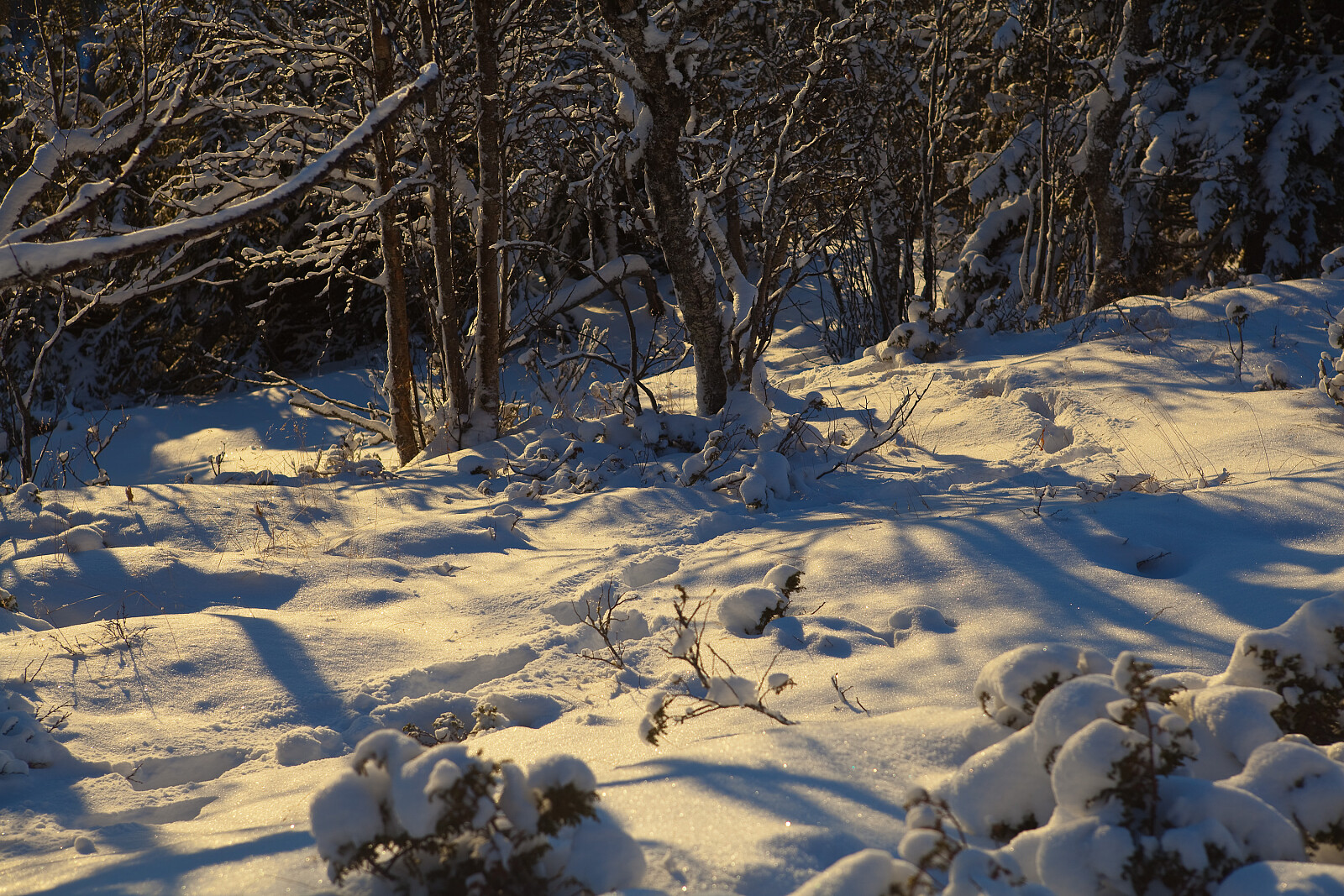Jeg lot det stå til, kjørte opp mot Skarvemellen på halvbrøytet vei. Det var ingen tid til normalveien, så jeg parkerte under sørflanken og tuslet inn i skogen. Lue og votter hadde jeg selvsagt glemt, så jeg håpet på fint vær.