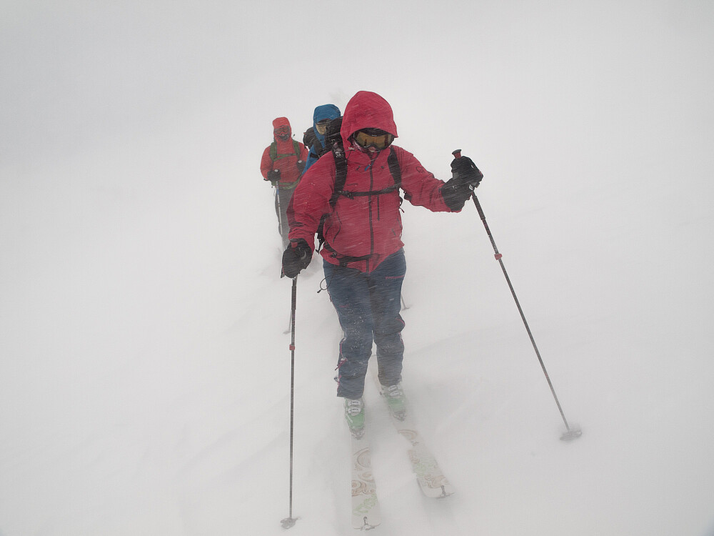 Snart dukket det blå flekker opp på himmelen, vinden kom og gikk i skogen, og plutselig stod vi der i sol og nøt utsikten utover dalen. Mye bedre enn kafé, syntes nå vi! Vi snodde oss oppover, langt unna alt som kunne være 30 grader, og kom snart til tregrensen. Der var Ole gitt! Jeg gikk ti meter bak Vegard, kunne knapt se ham, og sporene hans var allerede helt visket vekk. Vi prøvde en stund å gå bort til toppen av skiheisen, som vi tidvis kunne se, men ga opp. Det ble brått total whiteout rett rundt oss, selv om vi så steiner og trær lenger unna. Fotball-store snøballer ble usynlige etter to meter når vi kastet dem. Det var skredfare 3 allerede før denne vinden, som jeg lurer på om er den kraftigste vinden jeg har vært ute for med ski på beina, så greit å se hvor man går... Vi fulgte GPS-sporet tilbake til skogen, og på få meter var vi nede i svalende bris eller noe slikt. Føltes hvertfall sånn i forhold. Koste oss ned den lille nedkjøringa, og endte på en preppa langrennsløype i bånn av dalen. Den gikk litt oppover, men det var bare å slå ut med armene og vips suste man avgårde. Fyren i skiheisbua hadde dratt hjem.